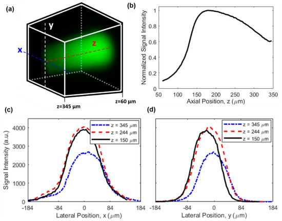 Characterization of the nonuniform signal efficiency. (a) A 3D image of a uniform fluorescein solution. Dimensions and orientation of the FOV are identical to those in Figure 3b, see also the coordinate system in the inset of Figure 1a. (b) On-axis signal intensity distribution along the z direction. Lateral signal intensity distribution along (c) x and (d) y direction at different z positions.