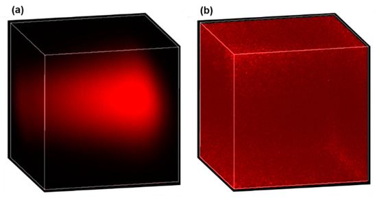 Effective correction for nonuniform signal efficiency by normalization. A 3D image of a uniform 10 µg/mL doxorubicin solution before (a) and after (b) normalization.