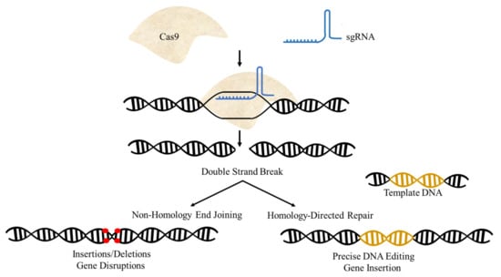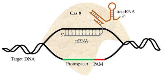 Originally identified as a Streptococcus pyogenes defense system against invading viruses, CRISPR/Cas9 was the first system used for genome editing in eukaryotes []. Cas9 is an endonuclease, which binds with CRISPR RNA (crRNA) and tracrRNA in order to recognize the target DNA []. Once the target DNA has been identified by the presence of the appropriate PAM, Cas9 creates a DSB at the target site (Figure 2). Cas9 contains two nuclease domains known as RuvC (a crossover junction endodeoxyribonuclease named for an E. coli DNA repair protein) and HNH (named for its characteristic histidine and asparagine residues), each with 1000–1600 amino acids. The gRNA varies from 18–24 nt; truncated gRNA of 17–18 nt shows higher specificity. Some Cas9 variants recognize PAMs other than NGG, increasing the range of potential target sites. TracrRNA and crRNA are fabricated as single gRNA in an engineered system used for genome editing in eukaryotes. Changes in gRNA sequence enable Cas9 nuclease systems to target any genome sequence where a suitable PAM is present. The system’s major limitations are the large size of Cas9 and the risk of off-target impacts [,,,].