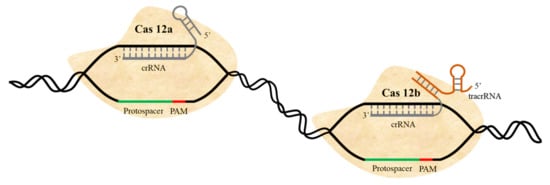 Like Cas9, the CRISPR/Cas12 system is a Class 2 system that creates programmed DSBs. It has been used as an alternative system for genome editing in plants, with comparable efficiency to Cas9 []. Cas12 requires a shorter crRNA than Cas9 does to create DSBs. Cas12 is smaller than Cas9 at around 1200 amino acids (aa) []. (Cas12b from Alicyclobacillus acidoterrestris and Alicyclobacillus acidiphilus are 1129 aa) and requires a 22-nt gRNA spacer for maximum efficiency. Cas9 recognizes a G-rich PAM (NGG) at the 3′ end, but Cas12 recognizes a T-rich PAM (5′-TTN for FnCas12a) at the 5′ end of the guide sequence (Figure 3). Cas12a, which is based on crRNA (while Cas12b uses an additional small tracrRNA as well), reportedly [] cleaves single-strand DNA (ssDNA), as well as double-strand DNA (dsDNA), and once activated, it cleaves ssDNA indiscriminately. Cas12a processes its pre-crRNA into mature crRNA without requirement of tracrRNA. Whereas Cas9 creates blunt ends at the cleavage site, Cas12 produces a staggered end. Cas12 has been used to develop a diagnostic method called DETECTR for ultrasensitive detection of infectious diseases. DETECTR has been used to detect various pathogens with high efficiency, accuracy, and speed []. In addition, loop mediated isothermal amplification (LAMP)-coupled Cas12a has been recently developed to accurately detect plant viruses []. The superior features of Cas12 compared to Cas9—smaller size, recognition of T-rich PAM, and production of staggered ends—make Cas12 a viable and powerful alternative tool for genome editing in crop plants [,].