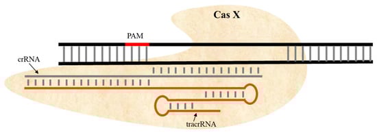 Schematic diagram of CRISPR/CasX. CasX is a dual-guided RNA enzyme utilizing crRNA and tracrRNA. It binds and cleaves dsDNA adjacent to an appropriate PAM site.