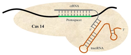 Schematic diagram of CRISPR/Cas14. This system utilizes Cas14 enzyme with two RNAs: crRNA and tracrRNA. It binds only ssDNA, and cuts without requiring a PAM site for recognition.