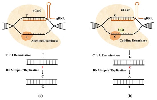 Schematic diagram of base editing with nickase Cas9 (nCas9). (a) ABE system uses nCas9 and adenine deaminase to catalyze transformation of adenine into guanine. ABE deaminates adenine to inosine (I), thus converting T-A to T-I. Repair machinery recognizes I as G and repair T-I as C-G; (b) CBE system utilizes nCas9 and cytidine deaminase to catalyze transformation of cytosine to uridine. Uracil glycosylase inhibitor (UGI) prevents U:G mismatch from being repaired back to C:G, and U is ultimately transformed into T.