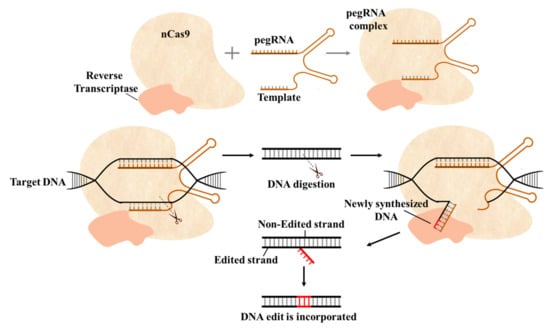 Prime editing is a recent development in CRISPR/Cas systems. It can be used to perform all 12 types of base substitutions [], targeted insertions [], deletions without creating DSBs, and the provision of donor template [,]. In prime editing, nCas9 is fused with reverse transcriptase (RT) and a prime editing guide RNA (pegRNA), a modified gRNA with extensions to encode primer binding site (PBS), RT-template for targeted modifications in the target sequence and a canonical gRNA for the second nick (Figure 7). After nCas9 cleaves the target site, reverse transcriptase uses pegRNA to introduce new genetic information at the target site. Prime editing has the potential to expand the scope of genome editing, especially in therapeutic applications. Although it has been suggested that prime editing could, in theory, correct 89% of known genetic mutations, such systems still need further improvement before they can be used for therapeutic purposes [,]. Prime editing holds an extraordinary potential to introduce precise modifications in crop genomes for functional genomics, stress tolerance, yield improvement, and disease resistance. Prime editing has been demonstrated for targeted genome editing in different plants, such as wheat, rice [], and Arabidopsis [].