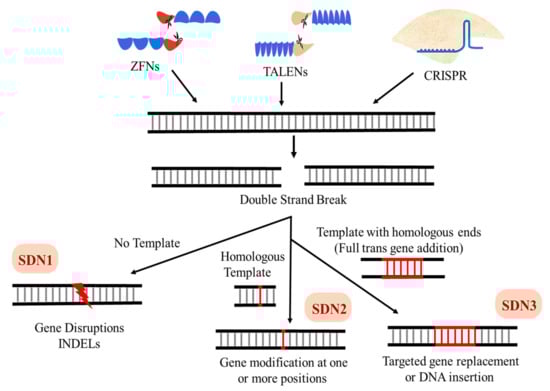 SDNs could potentially help developing countries to improve crops along with food security. Depending on genome modification and DSB repair outcomes, SDNs are classified as SDN1, SDN2, and SDN3 (Figure 8) []. This section discusses those modifications in detail.