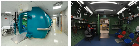 In practice, HBO therapy is administered safely in a hyperbaric chamber at pressures up to 3 atmospheres according to schedules defined for the different indications mentioned above. There are different types of chambers available, whereas hospitals prefer large multi-place chambers that can treat approximately 6–10 people at a time and can easily accommodate patients lying on stretchers or in hospital beds. In chambers equipped for the treatment of critically ill patients, hyperbaric physicians and nurses accompany the patients during treatment. However, our division is equipped with the largest walk-in and drive-in hyperbaric chamber in central Europe, which enables the simultaneous treatment of up to five intensive care patients and which may even be used for intraoperative hyperbaric oxygenation. About 1200 compressions are performed every year, corresponding to more than 5000 single treatment sessions for in-hospital patients or for those in outpatient care, respectively (Figure 1).