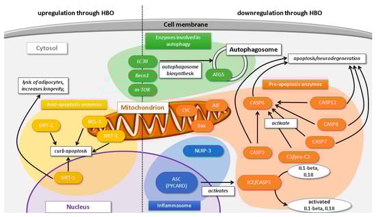 Current evidence suggests that hyperbaric oxygenation (HBO) exerts antiapoptotic effects via the downregulation of apoptotic enzymes: NLRP-3 interacts with components of damaged cells and, together with ASC, induces inflammation. Both form the inflammasome, engaging ICE/CASP1, which furthermore converts pro-inflammatory interleukins into an active form. C3/pro-C3 activates CASP6, CASP6/7/8/12 engage CASP3, and all mediate and effect apoptosis. CYC, Bax and AIF reside in the mitochondria and are pro-apoptotic. Conversely, the antiapoptotic mitochondrial enzymes SIRT1 (also present in nucleus and cytosol) and BCL-2 are upregulated by HBO which in turn enhance cell viability as they curb apoptosis. HBO exerts variable effects on proteins in the cytosol, LC3II, Becn1 and m-TOR, which are involved in autophagy processes; however, there is evidence that ATG5 protein residing in autophagosome membrane is downregulated by HBO.