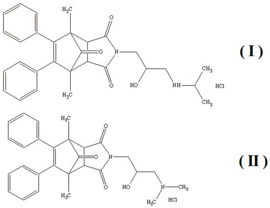 Structures of compounds (I) (4-[2-hydroxy-3-(propan-2-ylamino)propyl]-1,7-dimethyl-8,9-diphenyl-4-azatricyclo [5.2.1.02,6] dec-8-ene-3,5,10-trione hydrochloride) and (II) (4-[3-(dimethylamino)-2-hydroxypropyl]-1,7-dimethyl-8,9-diphenyl-4-azatricyclo[5.2.1.02,6]dec-8-ene-3,5,10-trione hydrochloride).