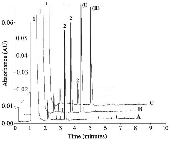 Representative electrophoregrams of: (A) 1.44 mM of p-nitrophenyl phosphate (PN-TE) (1) and 0.018 mM of the reaction product p-nitrophenol (PN-OL) (2) in 2 mL of incubation sample; (B) 1.44 mM of PN-TE (1) and 0.018 mM of the reaction product PN-OL (2) in the presence of 0.05 mM of (I) in 2 mL of incubation sample; and (C) 1.44 mM of PN-TE (1) and 0.009 mM of the reaction product PN-OL (2) in the presence of 0.05 mM of (II) in 2 mL of incubation sample.