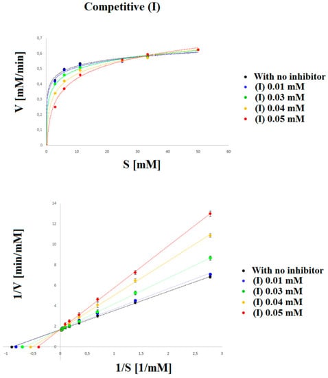 Lineweaver–Burk curves intersecting at one common point on the 1/Vmax axis indicate the stronger competitive type of inhibition (compound (I)), whereas curves having one common intersection on the 1/S axis indicate the weaker competitive type of inhibition (compound (II)) (Figure 3 and Figure 4). The Km and Vmax values were determined from the equation y = ax + b in the case of each line. By comparing these values for the system without and with inhibitor, the inhibition type was identified (Table 2).