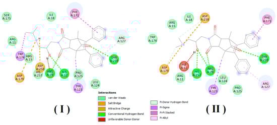 The obtained values of the binding free energy for compound (I) were slightly higher and amounted to −8.0 kcal/mol and for compound (II) −7.8 kcal/mol, which also confirmed the stronger bond of compound (I) to PAP than compound (II).