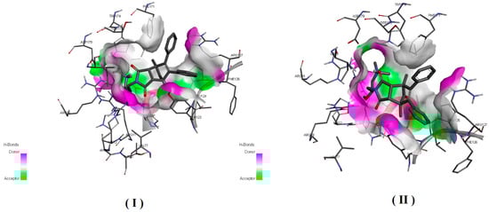 Predicted differences was due to structural diversity within the amino group and resulting from the occurring hydrogen interactions with polar amino acids at the binding pocket. In both cases, the protonated amino group formed an intramolecular hydrogen bond with the carbonyl group. The differences were due to the presence of an intermolecular hydrogen bond between ASP258 and the second hydrogen atom bonded to the amine group which was present in compound (I) but not possible for compound (II) due to the methylation. Additionally unfavorable donor–donor interaction with HIS12 occurred for compound II. The receptor–ligand interaction pattern is depicted in Figure 6 and bioactive conformation in a binding pocket is presented in Figure 7.