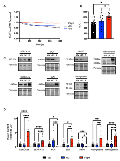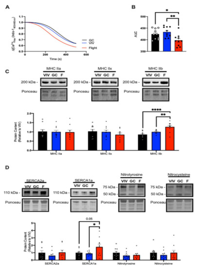 We next examined SERCA function in the fast-glycolytic TA muscle. Like the soleus muscle, TA muscles were smaller in the flight group compared with GC and VIV (Table 1). However, and in contrast with the slow-twitch soleus, SERCA assessment showed a significant increase in Ca2+ uptake in the flight group with a significant reduction in AUC compared to VIV and GC (Figure 3A,B). While fiber type transformations in the unloaded soleus have been well characterized, less is known regarding the potential changes in fiber type composition in the TA in response to spaceflight. Here, we found that the TA muscles from the flight group had no changes in myosin heavy chain (MHC) IIa or IIx content; however, there was a significant increase in MHC IIb compared with both VIV and GC (Figure 3C). When examining SERCA isoform content, we found no changes in SERCA2a, but there was a significant increase in SERCA1a content in the flight group vs. GC and VIV (Figure 3D). SERCA regulatory proteins, PLN, SLN, and NNAT, were not detected in the TA with up to a 40 µg of total protein loaded (data not shown). Furthermore, we did not find any changes in total protein S-nitrosylation and T-nitration (Figure 3D).