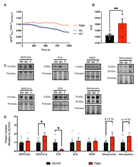 Spaceflight reduced Ca2+ uptake in the soleus from female mice. (A) Change in the ratio of Ca2+-bound to Ca2+-free Indo-1 (405/485 nm emission). (B) AUC was significantly increased in the flight group compared with GC/VIV representing reduced Ca2+ uptake. Representative Western blot images (C) and densitometric analysis (D) of SERCA2a/1a, PLN, SLN, NNAT, and total protein T-nitration and S-nitrosylation. All values are means ± SEM, and Western blot data are presented relative to GC/VIV control. * p < 0.05; ** p < 0.01 and values above bars indicate p-values using Student’s t-test (n = 4–8 per group).