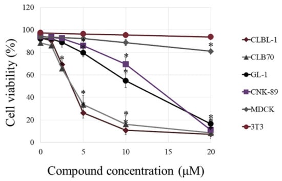 Comparison of the cytotoxic effect of benzyl isothiocyanate (BITC) on noncancerous and canine cancer cell lines. The cells were exposed to increasing concentration of BITC for 24 h. Cell viability was assessed by cytometric analysis following propidium iodide (PI) staining. The values are means ± SD of three independent experiments. * Considered significant in comparison with control (p < 0.05).