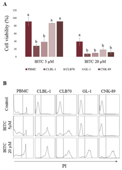 Comparison of BITC activity in canine peripheral blood mononuclear cells (PBMCs) and canine hematopoietic cancer cells (CLBL-1, CLB70, GL-1 and CNK-89) after 24 h incubation with BITC. (A) The number of viable cells in BITC treated groups was calculated as a percentage of the viability of untreated control cells. a,b Values with different letters in the superscript differ statistically within the same treatment group (p < 0.05). (B) Representative histograms of cells stained with PI.