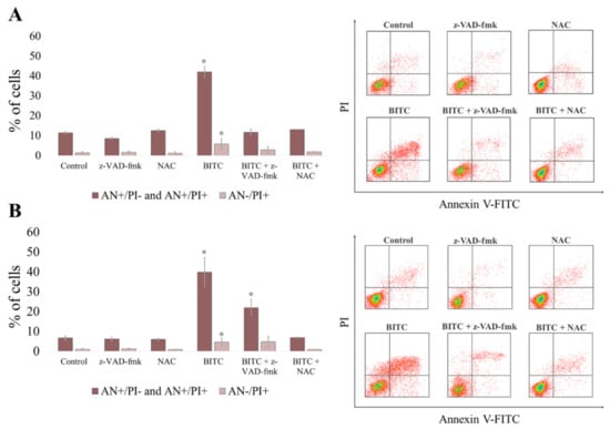 Apoptosis induced by BITC in CLB70 and CLBL-1 cell lines. CLB70 (A) and CLBL-1 (B) cells were incubated for 16 h with BITC (4 μM) and the number of cells stained with Annexin V-FITC/PI was measured in flow cytometric analysis. The values are means ± SD of three independent experiments. * Considered significant in comparison with control (p < 0.05).
