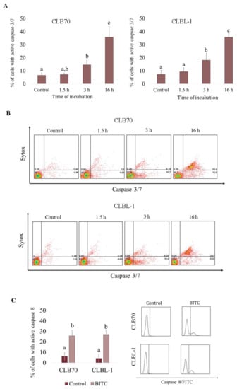 To further assess the role of caspases in the apoptosis induced by BITC, and to determine the time of apoptosis occurrence after exposure to the compound, we evaluated the activation of caspase 3/7. As shown in Figure 4A, 1.5 h exposure to BITC led to a slight, statistically irrelevant (p > 0.05), increase in caspase 3/7 activation, while after 3 h, the activation of caspase 3/7 was quite pronounced (p < 0.05). Specifically, the number of cells with active caspase 3/7 reached 14.57 ± 3.55% in CLB70 cell line and 18.09 ± 5.31% in CLBL-1 cell line. After 16 h incubation, the numbers rose to 35.77 ± 8.26% in CLB70 cell line and 35.72 ± 2.76% in CLBL-1 cell line (Table S4). Additionally, after 3 h incubation the majority of cells with active caspase 3/7 were negative for Sytox staining, indicating an early stage in the apoptotic process at this time point, while after 16 h the cells were positive for both dyes (Figure 3B). Moreover, 16 h exposure to BITC at the concentration of 4 µM boosted the number of cells with active caspase 8 to 25.77 ± 5.59% and 27.10 ± 3.73% in CLB70 and CLBL-1 cell line, respectively (Figure 4C and Table S5).