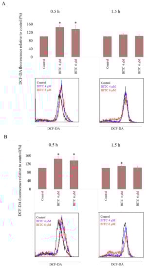 ROS increase after incubation with BITC. 2′,7′-Dichlorofluorescin Diacetate (DCF-DA) fluorescence was measured after incubation of CLB70 (A) and CLBL-1 (B) cells with BITC for 0.5 h or 1.5 h. The values are means ± SD of three independent experiments. * Considered significant in comparison with control (p < 0.05).