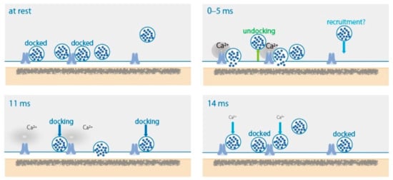 - Kusick, G.F.; Chin, M.; Raychaudhuri, S.; Lippmann, K.; Adula, K.P.; Hujber, E.J.; Vu, T.; Davis, M.W.; Jorgensen, E.M.; Watanabe, S. Synaptic vesicles transiently dock to refill release sites. Nat. Neurosci. 2020, 23, 1329–1338. [Google Scholar] [CrossRef] [PubMed]