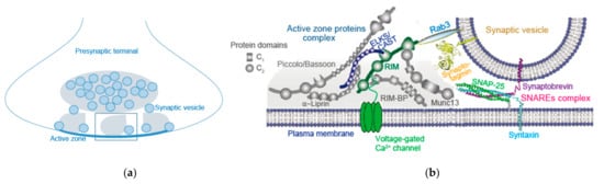- Südhof, T.C. The presynaptic active zone. Neuron 2012, 75, 11–25. [Google Scholar] [CrossRef] [PubMed] [Green Version]