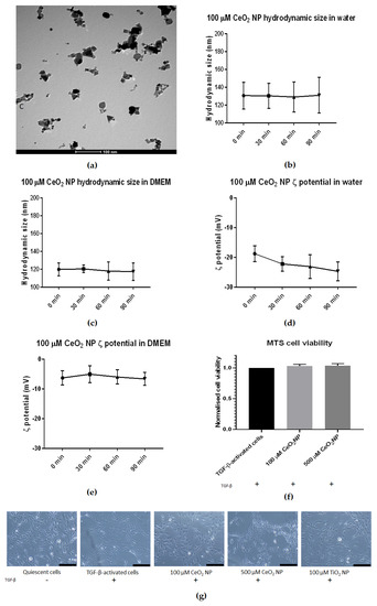 Characterisation of CeO2 NP used in this study. (a) TEM analysis revealed CeO2 NP to be cubic-shaped and approximately 25 nm in diameter. (b) DLS analysis revealed CeO2 NP hydrodynamic size in water to be stable over 90 min at approximately 130 nm (n = 3). (c) CeO2 NP hydrodynamic size in 1% DMEM showed a slightly smaller size at approximately 120 nm and was also stable over 90 min (n = 3). (d) CeO2 NP in water showed a downward trend in ζ potential (n = 3). (e) CeO2 NP ζ potential in 1% DMEM showed more stable ζ potential (n = 3). (f) 100 µM and 500 µM CeO2 NP showed similar cell viability as TGF-β-treated control cells when measured using MTS assay (n = 3). (g) Light microscope images taken at 10× magnification of quiescent cells, TGF-β-activated cells, 100 µM CeO2 NP, 500 µM CeO2 NP and TiO2 NP-treated cells (n = 3). Scale bar represents 200 µm. Error bars represent standard error of the mean (SEM); one-way analysis of variance (ANOVA) was used to calculate significance.