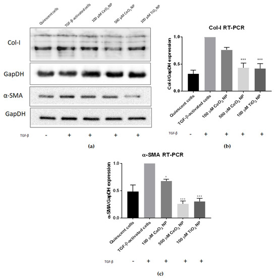 It can be seen that treating TGF-β-activated LX2 cells with CeO2 NP significantly reduced Col-I and α-SMA expression (Figure 2). Immunoblot images showed reduced Col-I and α-SMA protein expression (Figure 2a), demonstrating that CeO2 NP treatment reduced fibrogenesis marker expression. RT-PCR analysis of Col-I mRNA expression showed that 100 µM CeO2 NP (equivalent to 17.2 µg/mL) and 500 µM CeO2 NP (equivalent to 86.1 µg/mL) reduced Col-I by 24% percent and 67% percent respectively compared to TGF-β-activated controls (Figure 2b). Similarly, 100 µM and 500 µM CeO2 NP treatment showed significant reduction of α-SMA transcript expression (32% and 74% respectively) (Figure 2c). Titanium dioxide nanoparticles (TiO2 NP) have previously been shown to possess antifibrotic capacities [31] and k9were used as an experimental positive control in this study. Agreeably, 100 µM TiO2 NP (equivalent to 0.799 µg/mL) were able to significantly reduce Col-I and α-SMA expression in our experiments. Noticeably, only 500 µM CeO2 NP were able to reduce Col-I (67% vs. 69% reduction when measured using RT-PCR) and α-SMA expression (74% vs. 69% reduction when measured using RT-PCR) to levels comparable to 100 µM TiO2 NP.