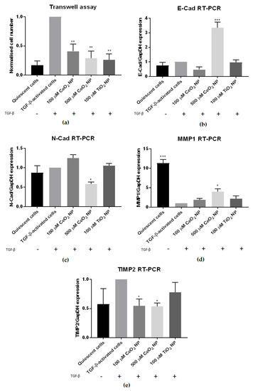 We went on to examine contractility by means of epithelial-mesenchymal biomarkers in CeO2 NP-treated cells. N-cadherin (N-cad) and E-cadherin (E-cad) expression was measured in CeO2 NP-treated cells using RT-PCR. At 500 µM, CeO2 NP significantly upregulated E-cad expression and downregulated N-cad expression (Figure 3b,c).