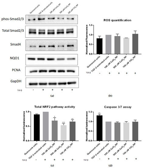 Lastly, light microscope images at 10× magnification were taken of LX2 cells after 24 h of incubation under different treatment conditions (quiescent cells, TGF-β-activated cells, TGF-β-activated cells with 100 µM CeO2 NP, TGF-β-activated cells with 500 µM CeO2 NP and TGF-β-activated cells with 100 µM titanium dioxide nanoparticles (TiO2 NP)). The morphology of NP/TGF-β-treated cells showed no obvious difference compared to TGF-β-activated cells, suggesting that these NPs did not exert any detrimental effects on cell morphology.