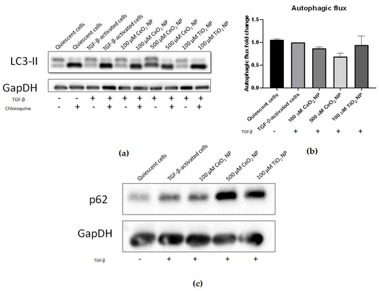 We sought to investigate if autophagy had been modified in CeO2 NP-treated cells through examining the expression of key autophagic markers. Microtubule-associated proteins 1A/1B light chain 3B (LC3-II) expression was compared between cells treated with and without chloroquine using immunoblotting to assess the degree of LC3-II accumulation and hence autophagic flux. It can be seen that 500 µM CeO2 NP treatment showed reduced autophagic flux compared to TGF-β controls (Figure 5a,b), again supporting that HSC activation is decreased in CeO2 NP-treated cells in a dose-dependent manner. However, this result was not found to be statistically significant. In addition, the expression of p62/sequestosome-1 (p62) was also analysed using immunoblotting. CeO2 NP-treated cells showed increased p62 expression in a dose-dependent manner (Figure 5c), demonstrating that CeO2 NP treatment was potentially able to inhibit autophagy.