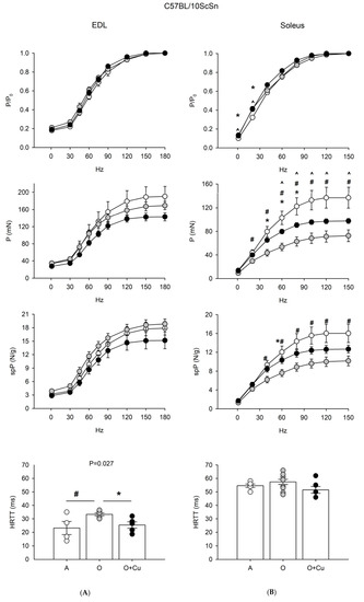 EDL of 24-month-old 10ScSn mice showed only a significant increase of HRTT (p ≤ 0.03) that was blunted by curcumin treatment (Figure 3). Conversely, 10ScSn soleus muscle displayed aging-induced reduction of both absolute (20–150 Hz) and specific (40–150 Hz) tetanic force development (p < 0.05), in the absence of changes for other contractile parameters (Figure 3 and Figure S3).