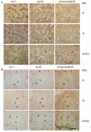 - Gorza, L. Identification of a novel type 2 fiber population in mammalian skeletal muscle by combined use of histochemical myosin ATPase and anti-myosin monoclonal antibodies. J. Histochem. Cytochem. 1990, 38, 257–265. [Google Scholar] [CrossRef]
