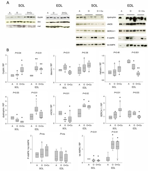 (A) Representative Western blots of costameric and regulatory proteins of soleus and EDL of 10ScSn mice. Samples correspond to soleus (SOL) and EDL muscles from Adult mice (A), vehicle-treated Old mice (O) and curcumin-treated Old mice (O + Cu) (see Supplementary Materials for loading reference). (B) Box plots of normalized values to total loaded protein stained with Red Ponceau (RP). Soleus and EDL data are expressed in arbitrary units relative to the corresponding adult values. Mean and median values are indicated by dotted and solid lines, respectively. n of soleus or EDL samples was A = 4; O = 5 or 6; O + Cu = 6. Comparisons were performed among groups of the same muscle. Indicated p value corresponds to ANOVA test; single or double asterisk indicates the presence of significant difference vs. A, or O, or both, after post-hoc analyses, as detailed in the text.