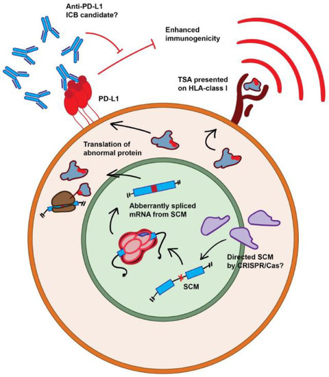 Immunogenic effects of alternative splicing and immune-based therapy options targeting aberrant alternative splicing. Mutations creating novel splice sites (SCM), either endogenic or induced by targeted CRISPR/Cas-based gene editing results in the creation of tumor-specific antigens (TSAs) through the translation of abnormally spliced RNA. Processing and presentation on HLA class I leads to enhanced T cell immunogenicity. The same process has also been implicated in the upregulation of PD-L1, potentially making such tumors candidates for immune checkpoint blockading (ICB) as PD-L1 typically suppresses immune activation. Red blunt arrows show negative regulation.