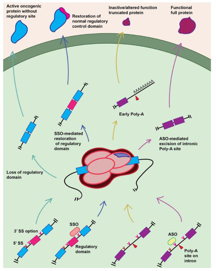 Oligonucleotide-based therapeutic modulation of splice site selectivity by endogenous splicing machinery. The presence of multiple different splice site options that all produce a viable mRNA transcript post-processing opens the possibility of incorrect selection of the correct splice site for the tissue or cell, with potential tumorigenic effects. SSOs can be used to bind splice sites and prevent recognition, therefore allowing the modulation of the produced protein. For instance, the figure shows a case where dysregulated splicing pathways cause incorrect splice site recognition, leading to the production of an oncogenic protein lacking a regulatory site (and thus presumably being constitutively active, promoting uncontrolled growth). The introduction of SSOs restores the proper splicing product, producing a normally controlled protein. More generally, ASOs can be used for a similar function. The figure depicts a case where dysfunctional splicing machinery leads to improper inclusion of an intron which contains within it a polyadenylation site, leading to premature polyadenylation and truncation of the product. Introduction of the ASO blocks recognition of this splice site that was allowing for the inclusion of the intronic polyadenylation site, restoring the normal protein product. Abbreviations: ASO, antisense oligonucleotide; poly-A, polyadenylation; SS, splice site; SSO, splice-switching antisense oligonucleotide.