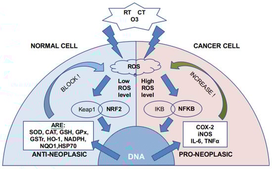 ROS generation by RT, CT, and ozone. According to previous cytoplasmic and mitochondrial ROS levels, different pathways are activated. Normal cells have a low ROS level, whereas cancer cells have high or very high ROS levels. The NRF2 pathway is almost exhausted in cancer cells, so more ROS activate the NFKB pathway.