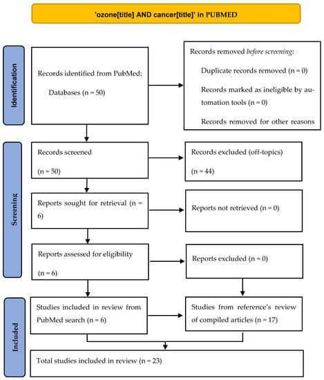 Our target has been to find articles in which ozone has been used to directly kill cancer cells according to the mechanism explained in the Introduction section of intracellular ROS increase, whether in vivo, in vitro, or in human patients. We found this approach interesting after reading two reviews [,] about the potential role of ozone therapy in oncology as it can be extremely safe for non-tumor cells. To fulfill our aim, we have done a systematic review following PRISMA guidelines [] by searching in the PubMed database the terms ‘ozone AND cancer’ in the ‘title’ field, finding 50 references. After a critical reading of title and abstract, only 6 references fulfilled our scope (Table 1 and Figure 2), and we read all of them (5 in vitro studies, 1 in vivo study). In order to widen our literature review, we did a detailed reading of the references in the papers found in the first search. From this reference’s scan in these papers and also in the two review articles mentioned above, we found (Table 2) 17 more articles (6 in vitro studies, 8 in vivo studies, 3 clinical studies). As we found very different kinds of articles (preclinical controlled, preclinical non-controlled, case series), a PRISMA checklist could not be fully accomplished, so we do not consider our paper as a strict systematic review but rather an evidence review. All 23 works are reflected in this paper and have been explained in detail both in the tables and in the main text of this article.