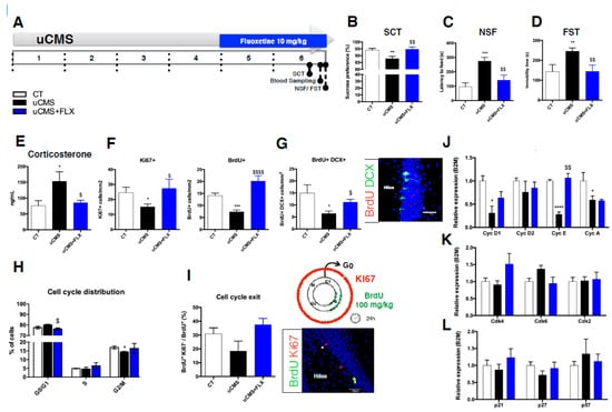 Cell cycle analysis in a uCMS animal model of depression. (A) Schematic representation of the experimental timeline used for the in vivo experiments. (B–D) Behavioral characterization of the animal model of depression. uCMS exposure induced an anhedonic profile (B) as well as anxiety (C) and depressive-like behavior (D). These changes were reversed by treatment with fluoxetine. (E). Diurnal nadir corticosterone levels measured in the serum of the animals. (F) Ki67 and BrdU (injected 24 h before sacrifice) and immunostaining cell densities in the hippocampal DG. (G). Number of BrdU/DCX double-positive cells (cell densities) in the hDG and BrdU/DCX immunofluorescence (scale bar = 40 μm). (H) Cell cycle distribution of hippocampal cells using PI staining and flow cytometry. (I). Cell cycle exit analysis using BrdU and KI67 immunostaining. Schematic representation of the BrdU administration paradigm and representative picture of the BrdU/Ki67 immunofluorescence in the DG. Scale bar = 50 μm. (J–L). Relative expression levels of G1 phase and S/G2 transition cyclins (J), CdKs (K), and Cdk inhibitors (L) in the hDG. Error bars denote SEM. * Denotes the effect of uCMS-exposure; $ denotes the effect of fluoxetine compared with untreated uCMS-exposed animals. */$ p < 0.05; **/$$ p < 0.01; *** p < 0.001; ****/$$$$ p < 0.0001. Abbreviations: CT: control; uCMS: unpredictable chronic mild stress; FLX: fluoxetine.