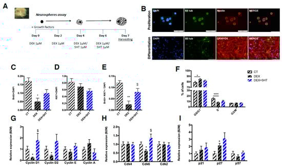 Neurosphere culture as a model to study the hippocampal progenitor cells proliferation and cell cycle. (A). Schematic representation of the neurosphere assay. (B). Representative pictures of immunofluorescence of neurosphere expansion and differentiation into neural phenotypes (scale bar = 100 μm). (C–E). Proliferation assessed by BrdU (24 h, C), Ki67 (D) and BrdU/Ki67 (E) immunostaining in split neurospheres. (F). Cell cycle distribution analysis with PI staining. (G–I). Gene expression analysis of G1 cyclins (G), Cdks (H), and CdK inhibitors (H). Error bars denote SEM. * Denotes the effect of DEX-stimulation; $ denotes the effect of 5-HT compared DEX-treated cells. */$ p < 0.05; ** p < 0.01; **** p < 0.0001. Abbreviations: CT: control; DEX – dexamethasone; 5-HT-serotonin.