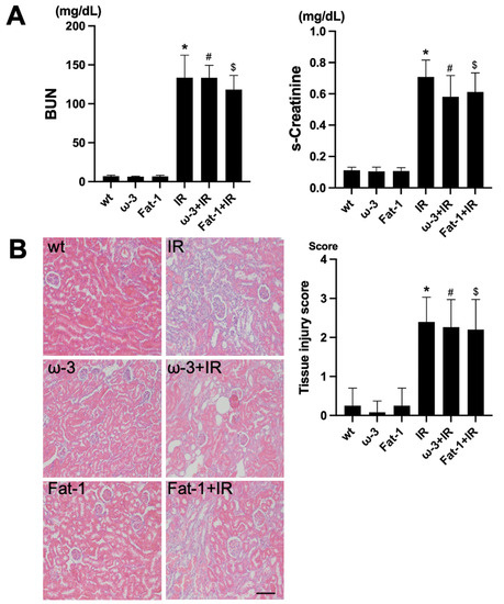 Renal function and histology in ischemia-reperfusion (IR) kidney. (A) The levels of blood urea nitrogen (BUN) and serum creatinine (s-Cr) were significantly increased in IR mice compared to wt mice. ω-3+IR mice also had higher BUN and s-Cr levels as compared to ω-3 mice, and Fat-1+IR mice also had higher BUN and s-Cr levels as compared to Fat-1 mice. (B) Representative kidney section with H&E stain; renal injury tissue represents cell debris, tubular necrosis, and inflammatory cells. Original magnification, 200×. Scale bar = 50 μm. * p < 0.001 vs. wt, # p < 0.001 vs. ω-3, $ p < 0.001 vs. Fat-1. The bar represents mean ± S.D. (wt, wild-type sham; ω-3, ω-3 PUFA oral administration sham; Fat-1, Fat-1 induction sham; IR, IR renal injury in wild-type mice; ω-3+IR, IR renal injury in ω-3 PUFA oral administration mice; Fat-1+IR, IR renal injury in Fat-1 induction mice).