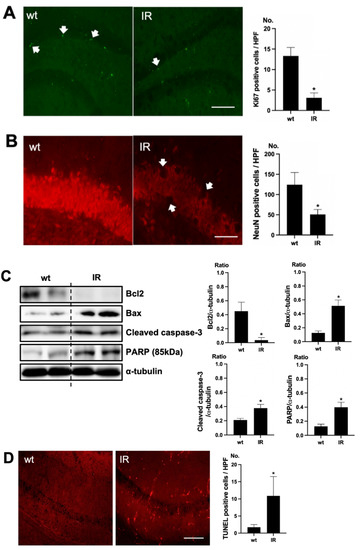 Brain damage in ischemia-reperfusion (IR) kidney. (A) Representative immunofluorescence stain of subgranular zone of the hippocampal DG of brain section: Immunofluorescent staining was performed using the markers of proliferation (Ki67) in brain. High power field (HPF), original magnification, 200×. Scale bar = 50 μm. (B) Representative immunofluorescence stain of subgranular zone of the hippocampal DG of brain section: Immunofluorescent staining was performed using the neuronal nuclei marker (NeuN) in the brain. Original magnification, 400×. Scale bar = 200 μm. (C) Representative Western blot of brain lysis: Western blot analysis shows renal injury—increased Bax, cleaved caspase3 expression, and decreased Bcl2 expression in the brain of uremic mice. Renal injury increased PARP (85 kDa) expression in the brain of uremic mice. (D) Representative TUNEL stain of subgranular zone of the hippocampal DG of brain section. Original magnification, 200×. Scale bar = 50 μm. * p < 0.001 vs. wt. Bar represents mean ± S.D. (wt, wild-type sham; IR, IR renal injury in wild-type mice).