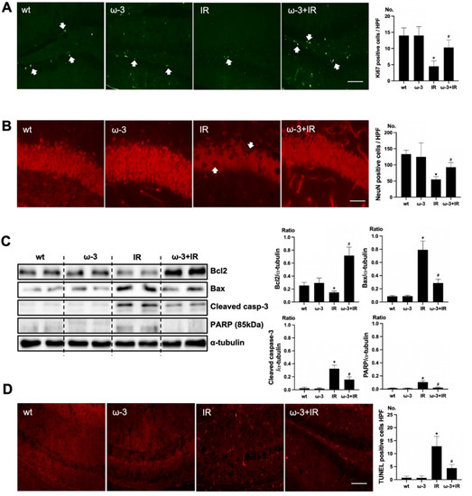 Effects of oral administration ω-3 PUFA on brain damage in ischemia-reperfusion (IR) kidney. (A) Representative immunofluorescence stain of subgranular zone of the hippocampal DG of the brain section: Immunofluorescent staining was performed using Ki67 in the brain. High power field (HPF), original magnification, 200×. Scale bar = 50 μm. (B) Representative immunofluorescence stain of subgranular zone of the hippocampal DG of brain section: Immunofluorescent staining was performed by using NeuN in the brain. Original magnification, 400×. Scale bar = 200 μm. (C) Representative Western blot of brain lysis: The brain of ω-3 PUFA-treated uremic mice showed decreased Bax, cleaved caspase3 expression, and increased Bcl2 expression compared to the brain of uremic mice. Additionally, PARP (85 kDa) expression was also reduced in the brain of ω-3 PUFA-treated uremic mice compared to the brain of uremic mice. (D) Representative TUNEL stain of the subgranular zone of the hippocampal DG of the brain section. Original magnification, 200×. Scale bar = 50 μm. * p < 0.001 vs. wt, # p < 0.001 vs. IR. Bar represents mean ± S.D. (wt, wild-type sham; ω-3, ω-3 PUFA oral administration sham; IR, IR renal injury in wild-type mice; ω-3+IR, IR renal injury in ω-3 PUFA oral administration mice).