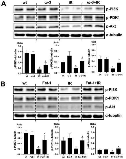 Effects of ω-3 PUFA on PI(3)K/Akt signaling. (A) Representative Western blot of brain lysis: The brain of ω-3 PUFA orally administered IR-injured mice shows increased p-PI3K, p-PDK1, and p-Akt expression compared to IR-injured mice. (B) Representative Western blot of brain lysis: The brain of IR-injured Fat-1 mice showed increased p-PI3K, p-PDK1, and p-Akt expression, compared to that of IR-injured mice. * p < 0.001 vs. wt, # p < 0.001 vs. IR. Bar represents mean ± S.D. (wt, wild-type sham; ω-3 PUFA, ω-3 PUFA oral administration sham; Fat-1, Fat-1 induction sham; IR, IR renal injury in wild-type mice; ω-3+IR, IR renal injury in ω-3 PUFA oral administration mice; Fat-1+IR, IR renal injury in Fat-1 induction mice).