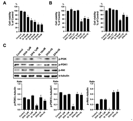Effects of DHA and EPA on IS toxicity in HT22. (A) IS significantly decreased the cell survival in HT22 cells in a dose-dependent manner. (B) NAC increased the cell viability in IS-treated HT22 cells. DHA and EPA also increased the cell survival in IS-treated HT22 cells. (C) Representative Western blot: IS-treated HT22 cells decreased p-PI3K, p-PDK1, and p-Akt expression. DHA and EPA post-treatment increased p-PI3K, p-PDK1, and p-Akt expression in IS-treated HT22 cells. * p < 0.001 vs. control, # p < 0.001 vs. IS. Bar represents mean ± S.D. (IS, indoxyl sulfate; NAC, N-acetylcysteine; ET, ethanol; MT, methanol; DHA, docosahexaenoic acid; EPA, eicosapentaenoic acid).