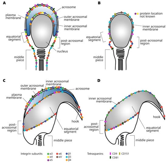 Localization of integrin subunits and tetraspanins in human (A,B), mouse (C,D), acrosome-intact (A,C), and acrosome-reacted sperm (B,D).
