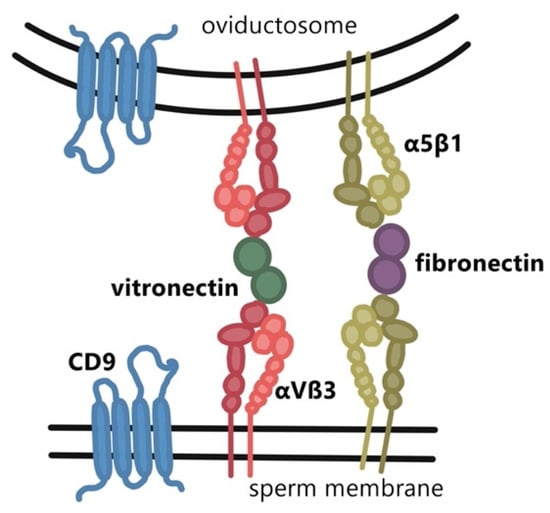 Integrins together with tetraspanins (e.g., CD9 and CD81) play a key role in the interaction of sperm with components of oviductal fluid. Reproductive fluids in both male and female genital tracts are known to contain extracellular microvesicles and exosomes. These are membrane-coated vesicles used for transferring the required proteins onto the sperm surface during maturation in the epididymis and subsequently in the female reproductive tract [43]. Upon binding to the oviductal reservoir, sperm comes into contact with oviductal fluid vesicles, so-called oviductosomes [44], which contain large numbers of proteins [45].