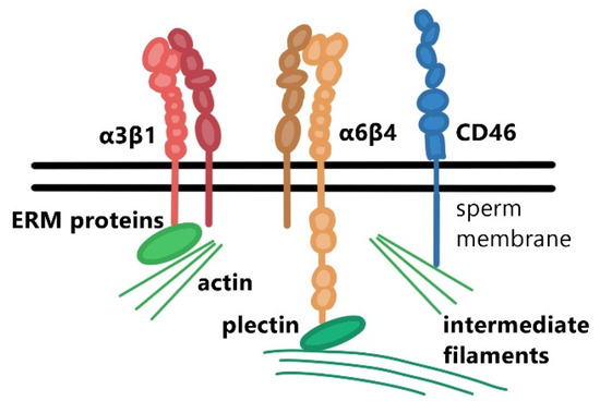 Schematic depiction of integrin heterodimers and the CD46 protein anchored in a sperm membrane facilitating interaction with the cytoskeleton via ERM proteins (ezrin, radixin, moesin) or plectin.