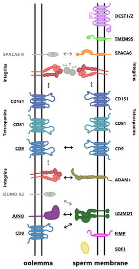 Tetraspanins are the main binding partners of integrins in gametes. Several tetraspanins have been found in sperm (Figure 1), mainly, CD9 [57,69,70,71], CD81 [57,72], and CD151 [12]. They are proteins with four transmembrane domains and two extracellular regions, and their main role is to regulate the arrangement of membrane protein complexes (such as receptors, signaling proteins, and fusogens). Tetraspanins participate in the reorganization of membranes, relocation of proteins, stabilization of individual sperm compartments, and can modulate the function of other members of protein networks, mainly through association with integrins such as α3β1 and α6β1 [73] or αVβ3 [74]. These bonds can be either direct (CD151) or indirect through other tetraspanins (CD9 and CD81).