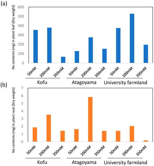 We collected approximately 5–10 kg soil (5–20 cm soil depth) from each of the three sites. Soil samples were collected from sampling points free of plants, although weeds were growing near the sampling point at Atagoyama. After sieving the collected soils (<φ2 mm), 350 g soil was added to each Neubauer pot (100 cm2; Fujiwara Seisakusho, Ltd. Tokyo, Japan). The soil water content was adjusted to 60% of the maximum water-holding capacity. Ice plant seeds were sown in the pots, and seedlings were grown for 3 weeks. Then, at 1 week intervals, saline solution was added to achieve final Na concentrations of 50 mM, 200 mM, and 350 mM by NaCl solution with liquid fertilizer (Hyponex, HYPONeX Japan Corp., Osaka, Japan). The plants were then grown for a further 6 weeks. After 10 weeks of growth in total, the fresh weights and dry weights of the above-ground parts and roots of the ice plants were determined. To determine sodium (Na) uptake, the leaves and roots of the harvested ice plants were separately dried and crushed. Then, a 0.1 g sample (leaf or root) was placed in a 15 mL tube, 750 µL nitric acid was added in accordance with the modified method of Yamaki [50], and the mixture was incubated for 30 min. MilliQ water was added to complete the volume to 15 mL, and then the mixture was shaken for 30 min. After filtration, the solution was diluted 50-fold, and the amount of Na absorbed was measured, using a microwave plasma atomic emission spectrophotometer (Agilent Technology 4100 MP-AES, Agilent Technologies Japan, Ltd., Tokyo, Japan).