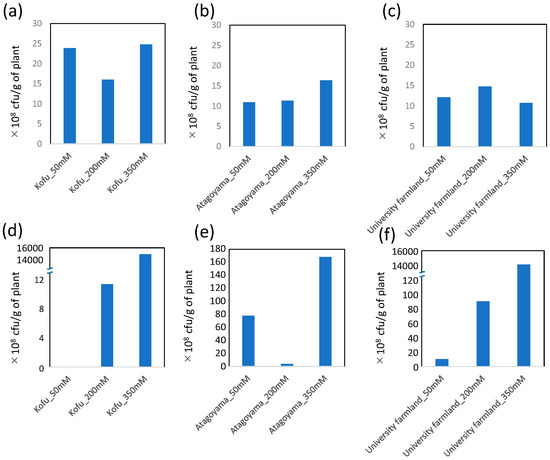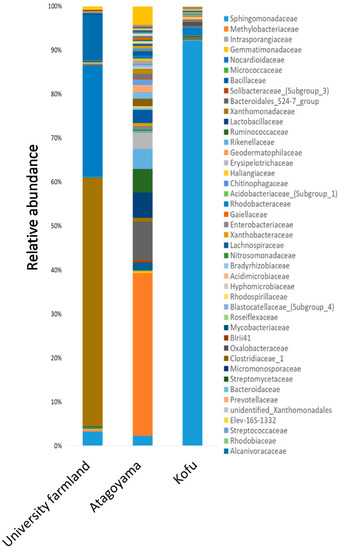 In all soils, the number of endophytic bacteria increased in parallel with the salt concentration applied. However, the number of rhizosphere bacteria was similar between treatments, regardless of salinity (Figure 2). The endophytic bacterial composition in the three different soils containing 350 mM NaCl was as follows: university farmland soil, 56.5% Xanthomonadaceae, 25.55% Rhodobacteraceae, and 10.41% Alcanivoracaceae; Atagoyama soil, 36.92% Methylobacteriaceae, 8.67% Bacteroidales_S24-7_group, 5.77% Lactobacillaceae, and 5.34% Ruminococcaceae; Kofu soil, 92.23% Sphingomonadaceae (Figure 3).